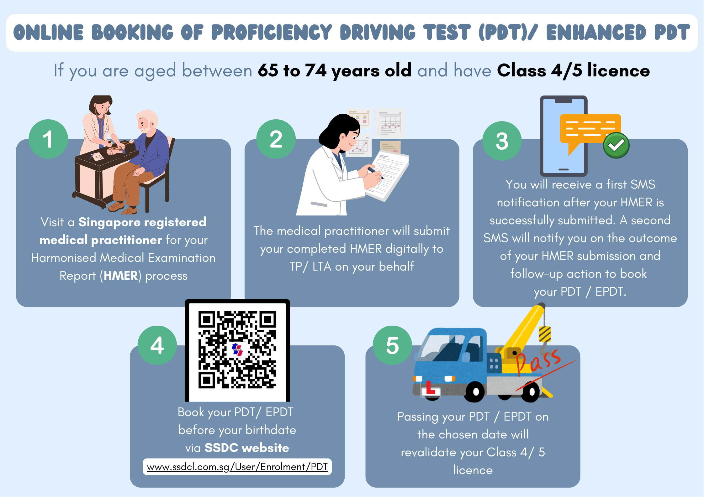 The medical practitioner will submit your completed HMER digitally to TP/ LTA on your behalf. You will receive a first SMS notification after your HMER is successfully submitted. A second SMS will notify you on the outcome of your HMER submission and follow-up action to book your PDT / EPDT. You may proceed to register online for the test at SSDC.